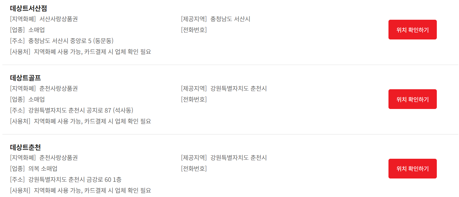 | 강원 | 데상트 홍천점 | 홍천사랑상품권 | 홍천군 홍천읍 홍천로6길 9 | - | 소매업 등록 가맹점 |