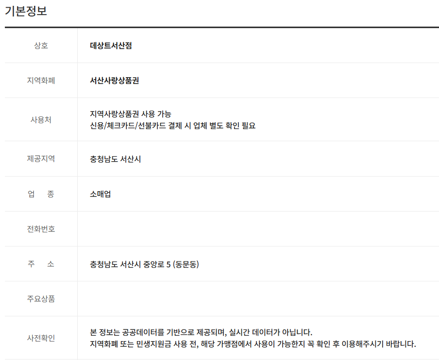 | 지역 | 매장명 | 지역화폐 | 주소 | 전화번호 | 비고 |