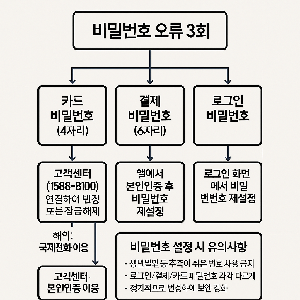 | 카드 비밀번호 (4자리) | 오프라인 단말기 결제, 현금서비스 | 결제 거절, 단말기 오류 표시 | 앱·홈페이지 [카드비밀번호 등록/변경] → 본인인증 후 재설정 잠금 해제는 고객센터(1588-8100) 필요 |