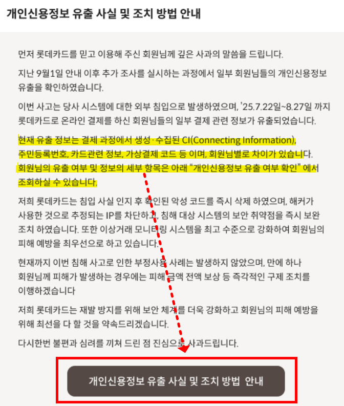 👉 롯데카드 앱/홈페이지에서 확인하거나, 개별 안내 문자를 받았다면 유출된 것입니다.