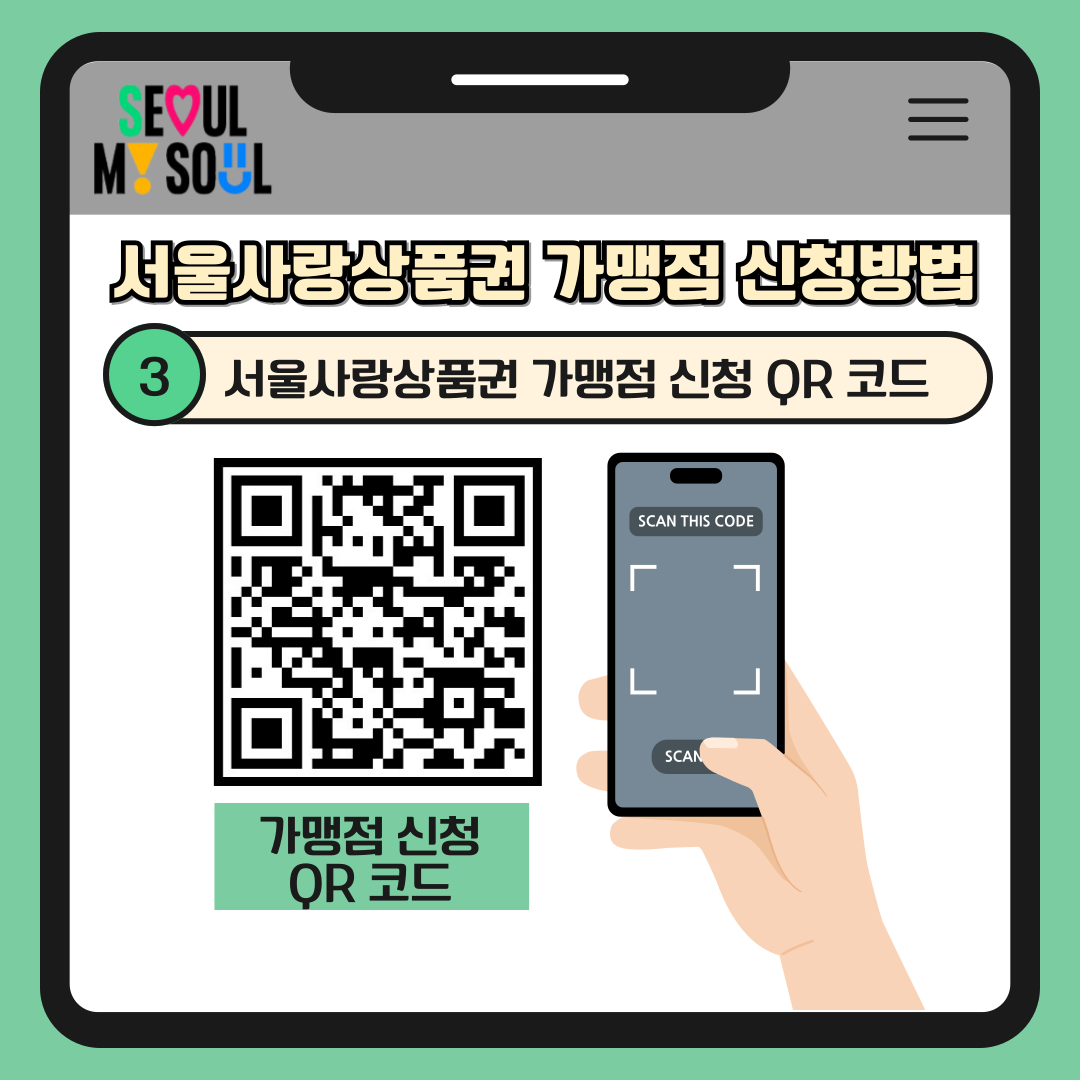 포스터에 있는 가맹점 신청 QR코드를 스캔하면 신청 페이지로 바로 이동됩니다.