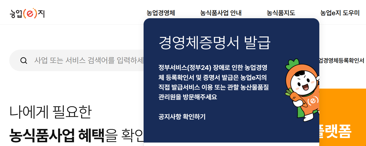 | 농업경영체 등록 확인서 | 농업 e지(nongupEZ), 농산물품질관리원, 주민센터 | 온라인·오프라인 혼합 경로 |