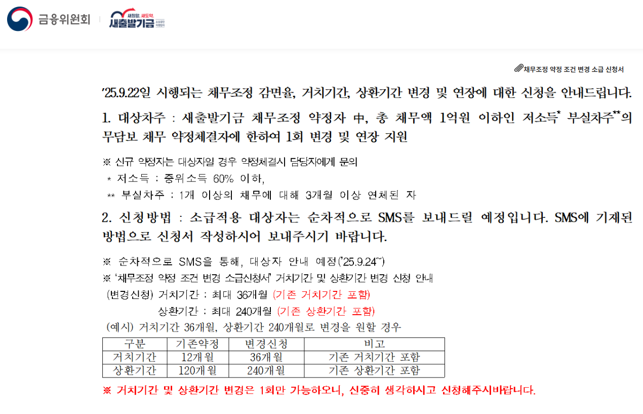 - 지원 방식: 원금 감면, 이자 조정, 상환 기간 최장 20년 연장, 최대 3년 거치 제공