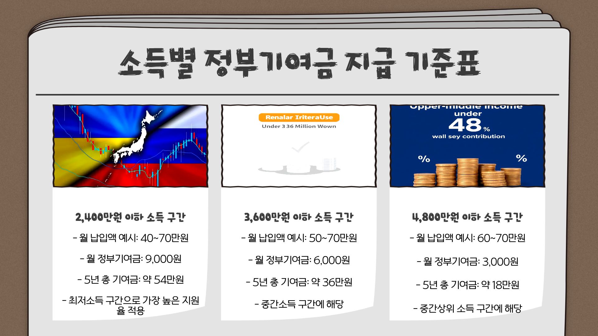 | 개인소득(총급여 기준) | 월 납입액 예시 | 월 정부기여금 | 5년 총 기여금(예상) | 비고 |