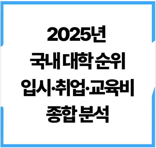 2025학년도 국내 대학 종합 랭킹은 취업률, 교육비, 입시결과, 연구력, 대기업 취업률, 국제화 지표 등을 종합해 산출되었습니다. 이번 순위는 의·과기원(KAIST 등), 교대, 예체능·분교 제외 기준이며, 자료는 ▲QS World University Rankings 2025 ▲통계청(KOSIS) ▲워크넷 ▲대학알리미 등을 참고했습니다.