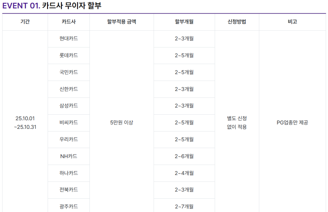| 카드사 | 할부 적용 금액 | 할부 개월 | 신청 방법 | 비고 |