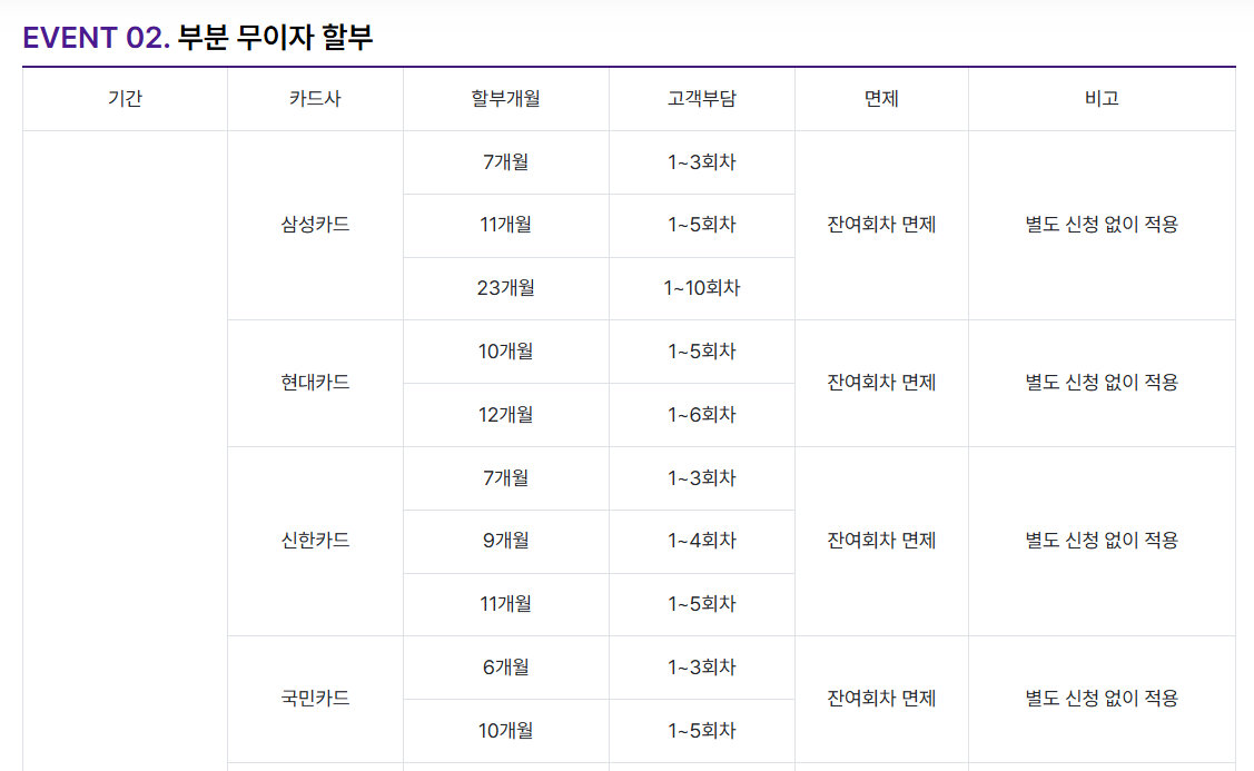 | 카드사 | 할부 개월 | 고객 부담 회차 | 면제 | 비고 |