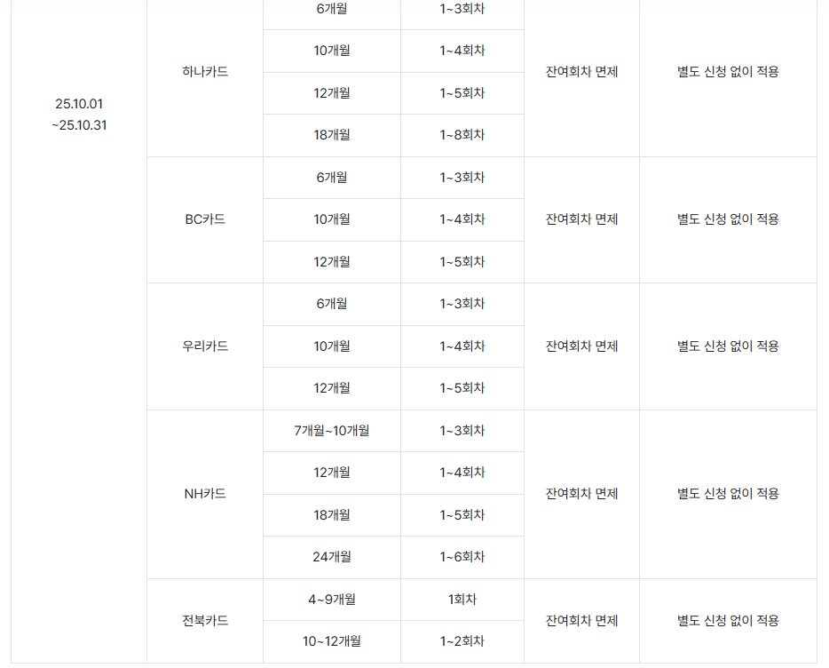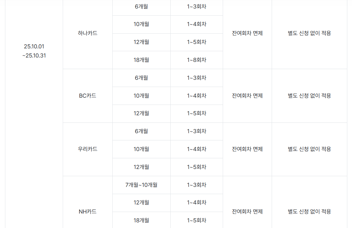 | BC카드 | 6개월 | 1~3회차 | 잔여 회차 면제 | 〃 |