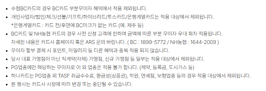 - 수협BC, 법인/체크/선불/기프트/하이브리드/토스/은행계열카드 등은 적용 불가