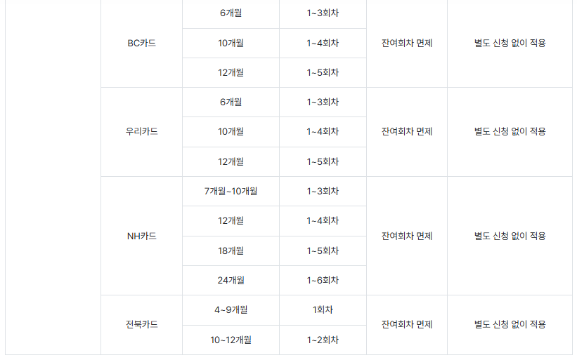 | 카드사 | 할부 개월 수 | 고객부담잔여회차 | 면제 여부 |