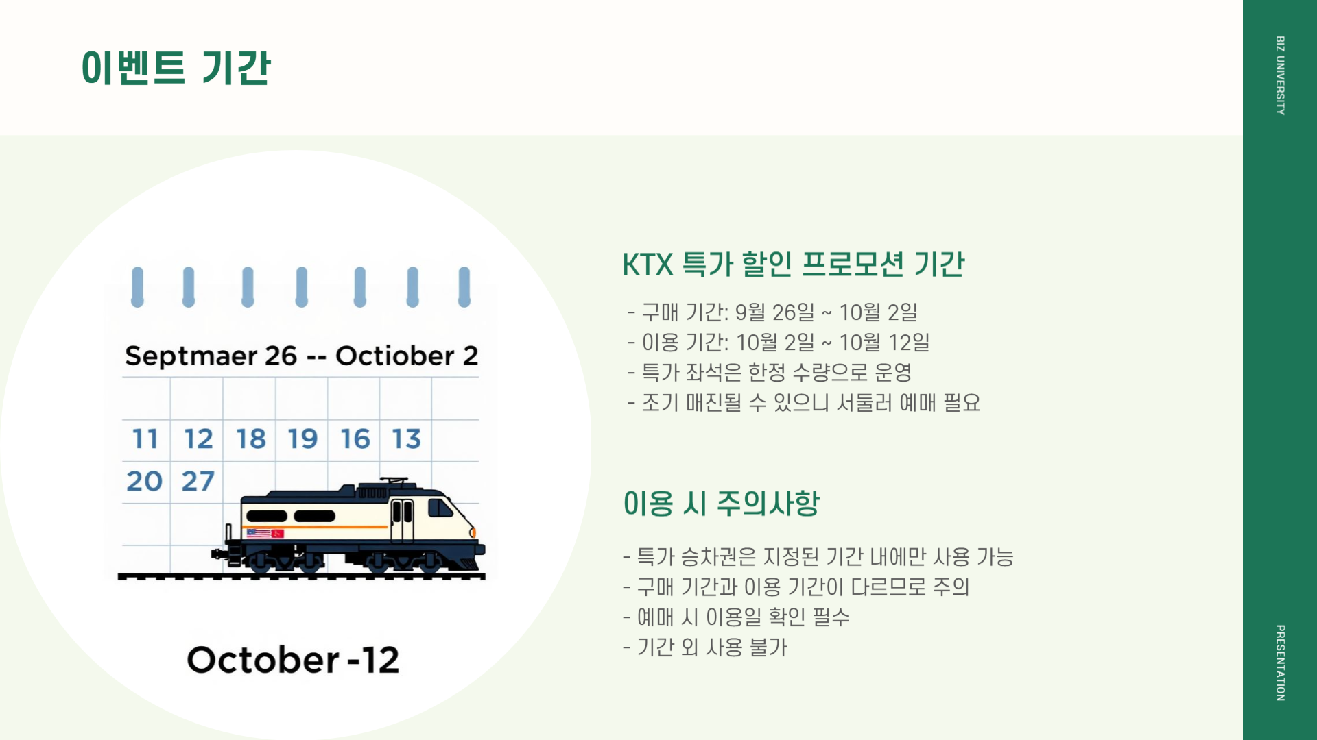 - 좌석: 일반실 전용(특실 불가)