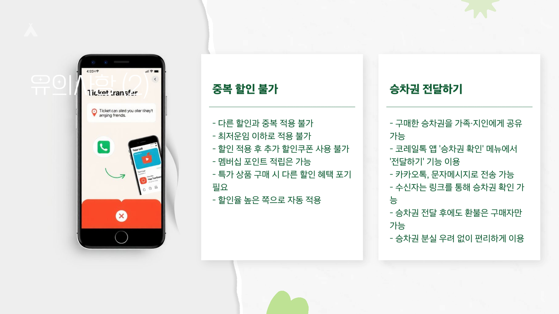 - 도중 하차 후 반환 불가(타 할인과 중복 불가, 최저운임 이하 할인 불가).