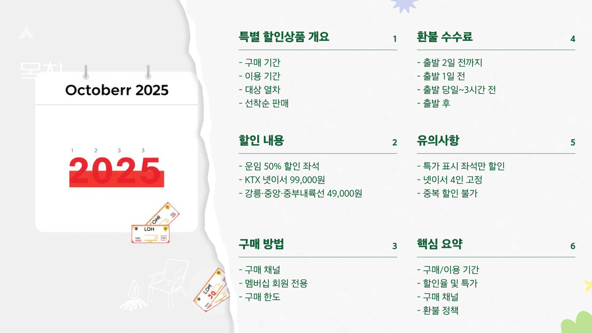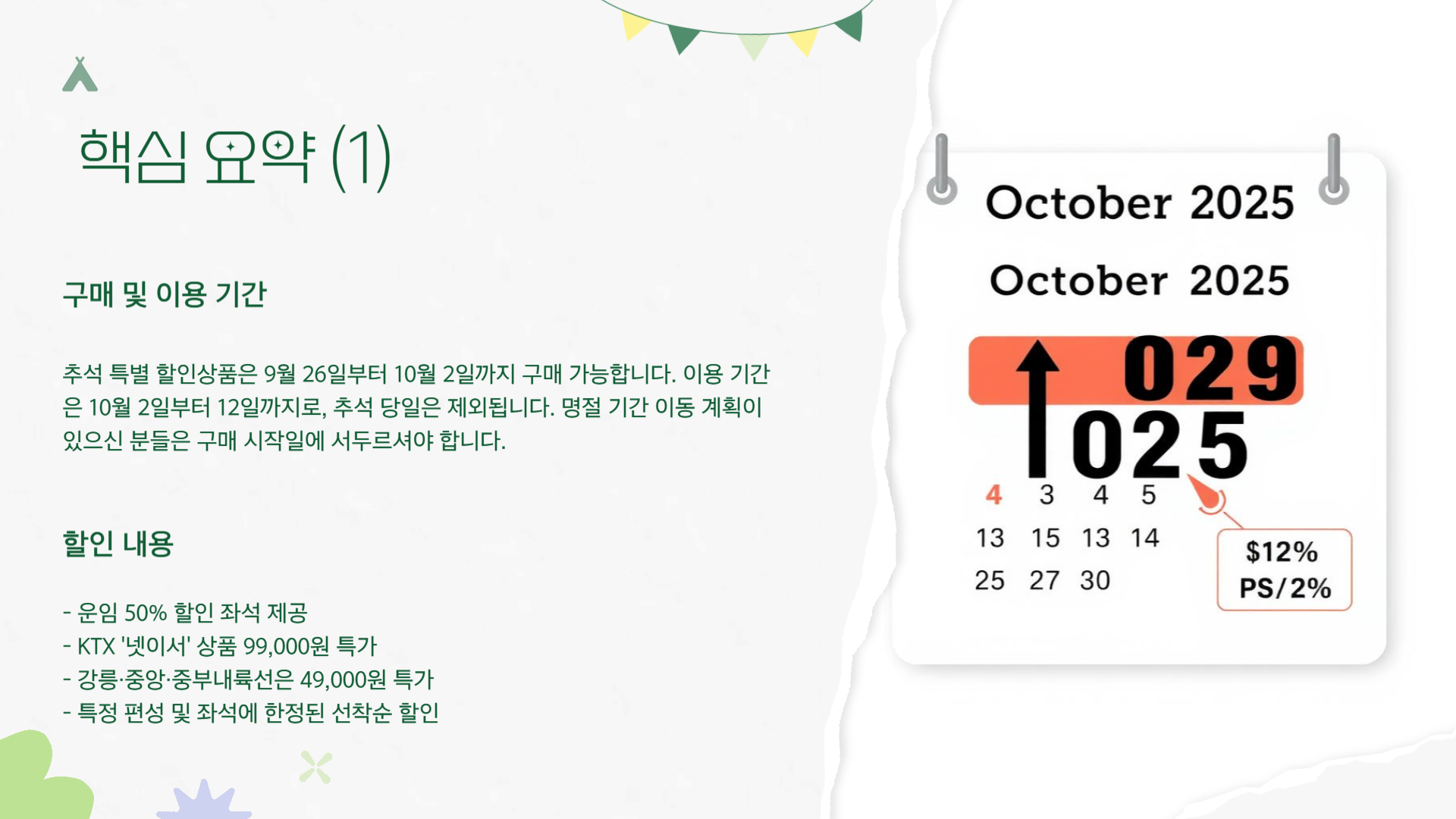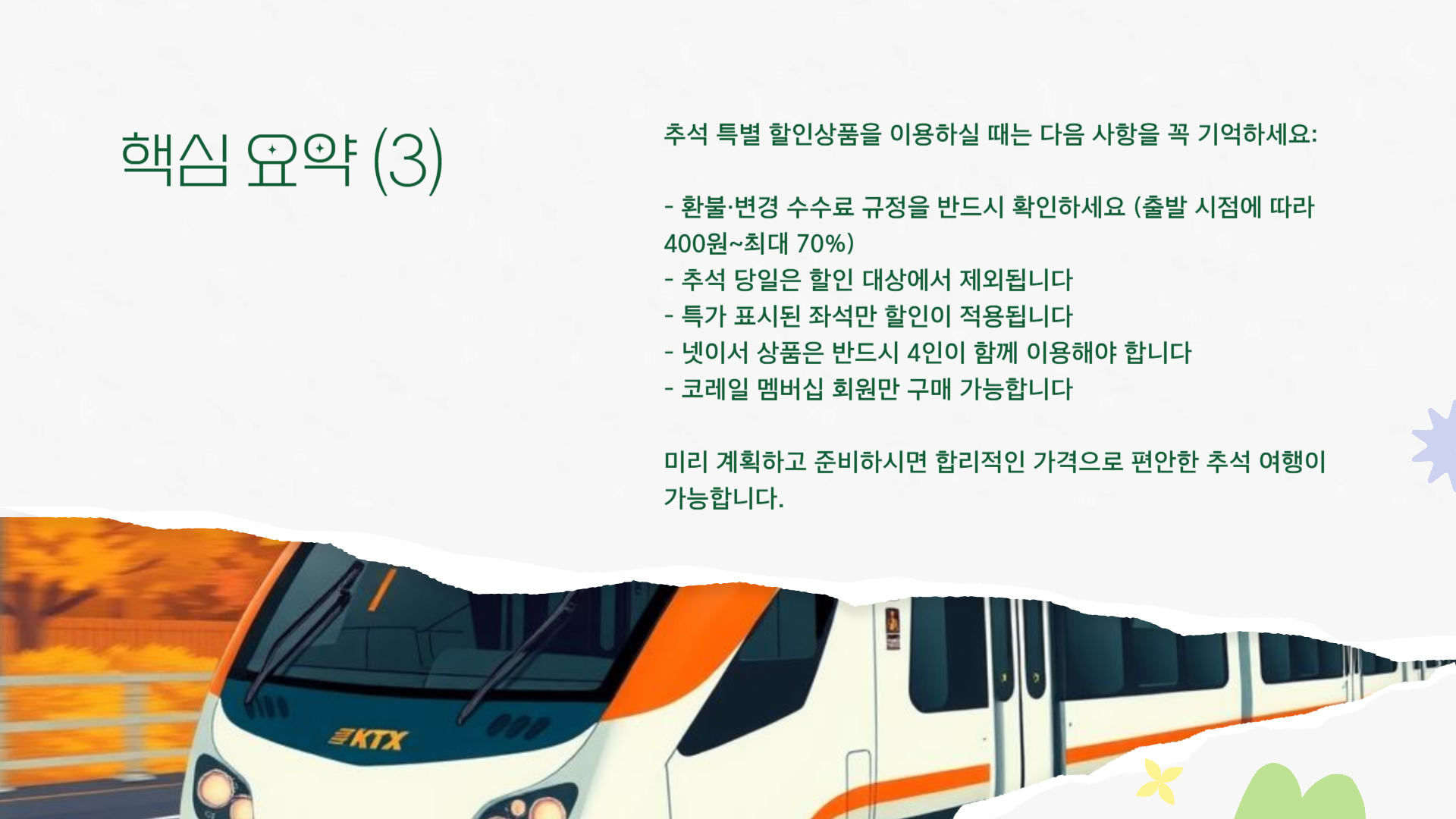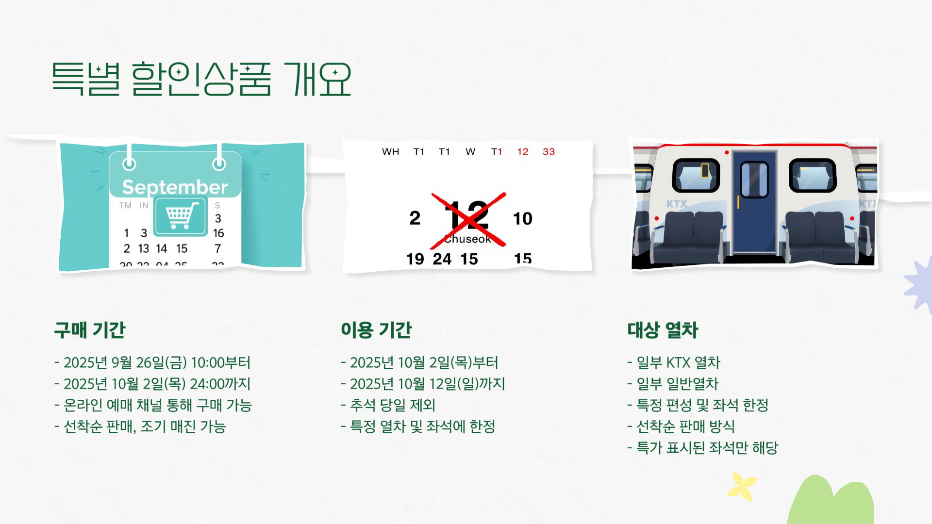 2025 추석 연휴 KTX·일반열차 특별 할인상품 안내! 50% 할인과 ‘넷이서 99,000원’ 혜택, 구매 기간·방법·환불 수수료까지 이해하기 쉽게 정리했습니다.