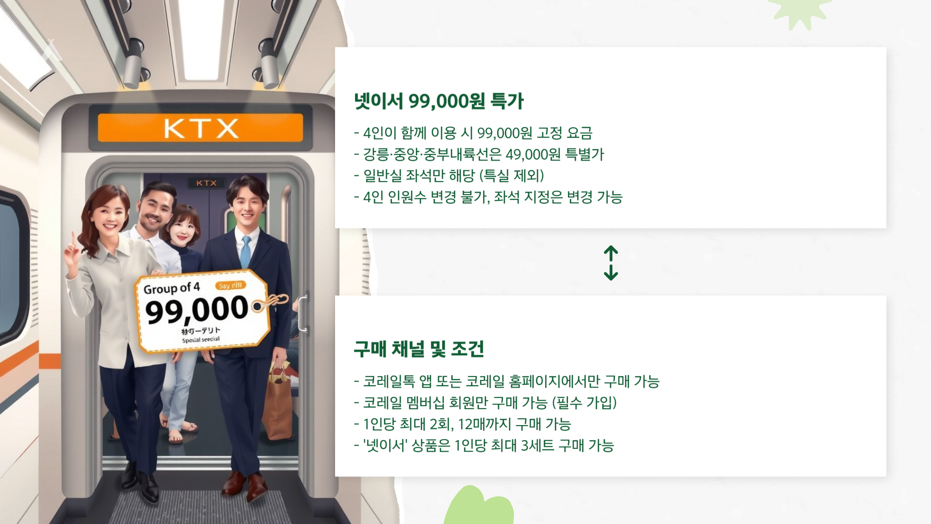 ‘넷이서 99,000원’이면 1인 24,750원 꼴! 노선·편성·좌석 운영에 따라 체감 할인은 달라질 수 있어요.