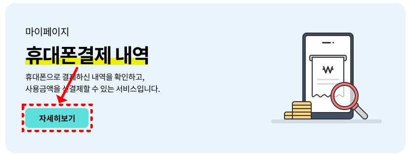 - 마이페이지 → 요금조회 → 휴대폰 결제 내역으로 이동합니다.